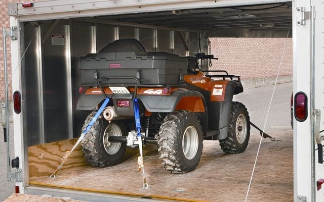 NOTE: foam filter oils have a solvent in their product, let the treated filter stand or gas off before installation. Now that you’ve completed your maintenance check, are you ready to take the road? Next up, are more useful tips on transporting your ATV. Carrying your ATV – Are you legal? This article has been prompted by recent information that some trail riders are transporting ATVs that are not tied down in their enclosed trailers. Applying the parking brake is not enough; and the law doesn’t recognize the parking brake as security feature. The law only recognizes a bona fide tie-down system. While researching this information, ATV Trail Rider found a document called the National Safety Code Standard 10 – Cargo Securement Standard, dated September 23, 2004. This document is used by the Provincial Ministries, Federal Motor Vehicle Groups, and police forces across Canada as a reference for defining different securing issues.